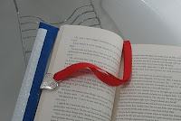 It would have been SO cool to paint with bubble wrap, or roll myself in it (hard to photograph)(and probably not a good look), or maybe wrap the cat......... or perhaps not. So in the end I solved the problem of keeping my book dry while I'm in the bath. And I got to use some of a lovely big roll of book binding tape that I've been hoarding. I re-used a bubble-wrap envelope by cutting it up and then stapling and taping it back together in a better shape. I was a bit concerned that I wouldn't know which side of the book to pick up, so that's why there's an arrow on the front. This way up. And then of course it needed a bookmark that was fairly waterproof too, and reflected my love for reading.